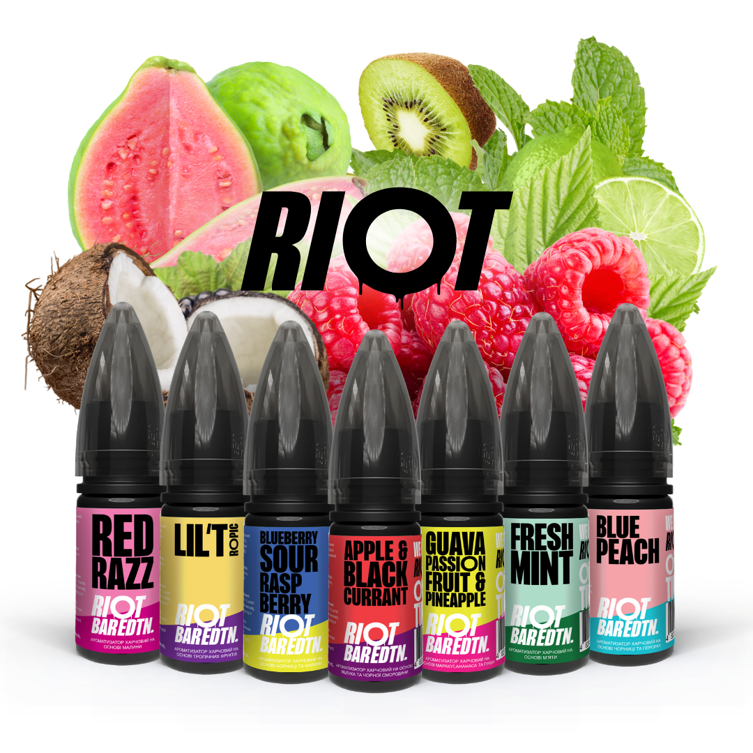 RIOT — британський виробник ароматизаторів для вейпінгу, який став лідером у своїй галузі завдяки інноваційним підходам до створення смаків та сміливій філософії. Їхня мета — допомогти людям позбутися залежності від тютюну без відмови від тих задоволень, які вони люблять. RIOT вірить, що вейпінг працює, і хоче, щоб весь світ про це дізнався.